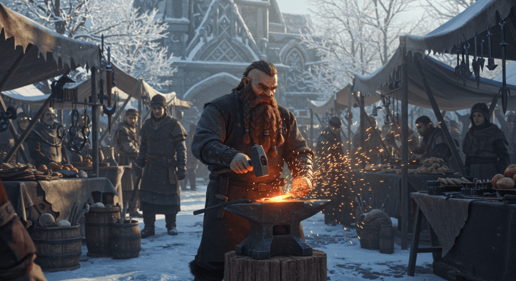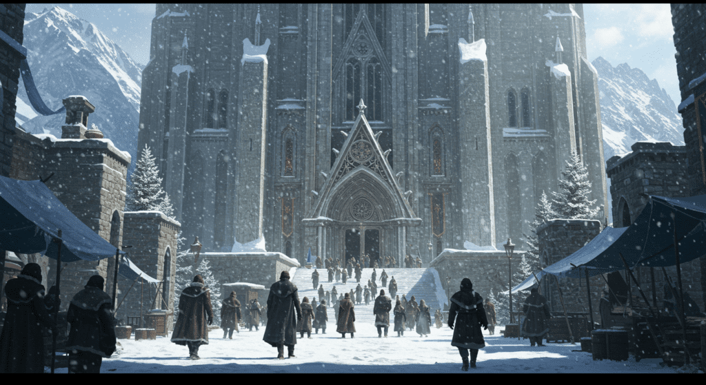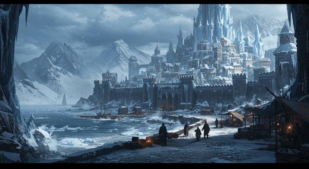 Tiren’s lifeline to the outside world, Frostspire Harbor is a marvel of engineering and magic. The harbor remains functional year-round, thanks to enchantments that keep its waters free from ice. Massive ships bring goods and travelers from across Nathakra, making it a hub for trade and exploration.
