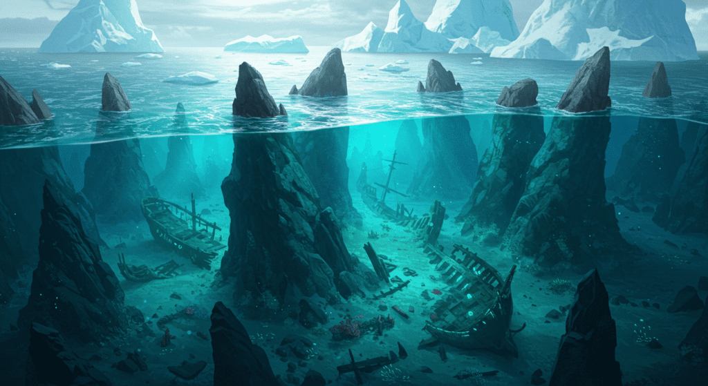 Trade by sea, though less common, is no less significant. Merchant vessels brave the icy waters of the Frigid Depths to dock at Frostspire Harbor, but their journey is fraught with peril. The Frozen Fangs—a treacherous stretch of razor-sharp icebergs and uncharted waters—stands between Tiren and the open ocean. These frozen peaks hide unseen dangers beneath the waves, with rumors of ancient sea creatures and spectral entities haunting the pass. Despite the risks, seasoned captains take on the challenge, bringing rare and exotic goods to Tiren’s markets, from Satyr wines and instruments to enchanted components and arcane tomes.